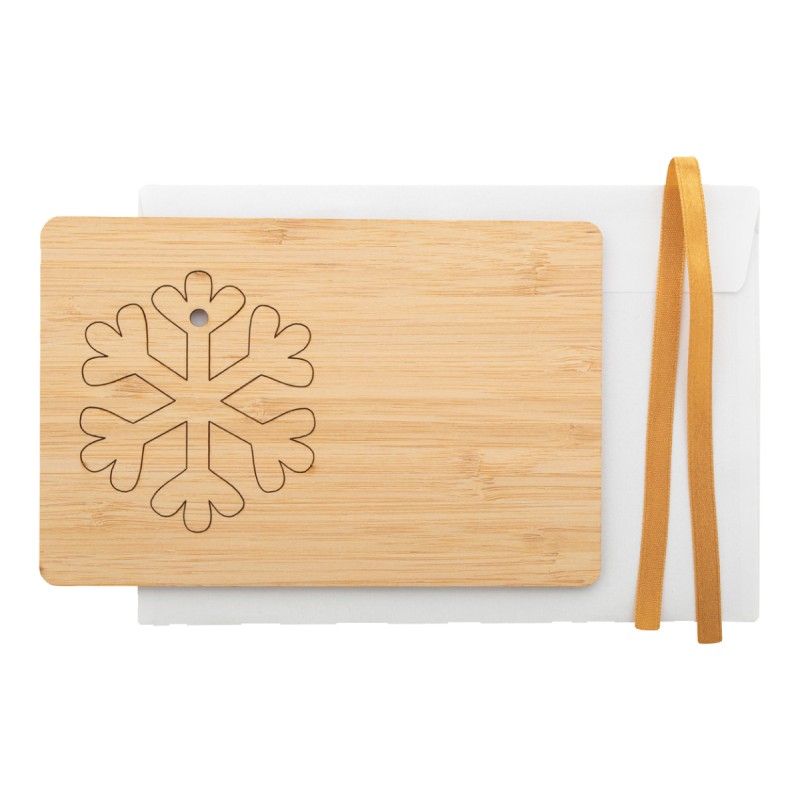 Carte de Noël en contreplaqué de bambou décortortion arbre de Noël avec ruban doré. Enveloppe postale C6 comprise. Livrée avec ruban détaché.