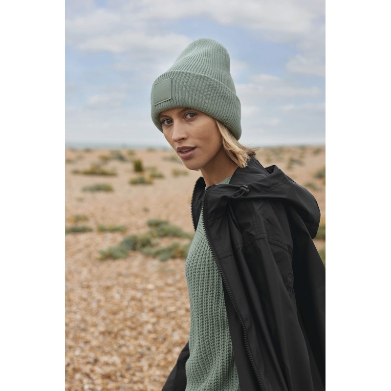100% Polyester Recyclé. Tricot à mailles. Calotte à pinces invisibles pour un maximum de confort. Patch décoratif en sergé de coton ton sur ton avec revers large pour une décoration optimale.