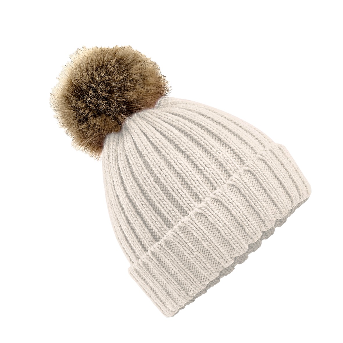100 % acrylique touché doux. Étiquette détachable TearAway. Bonnet avec revers, maille côtelée épaisse. Pompon amovible en fausse fourrure.