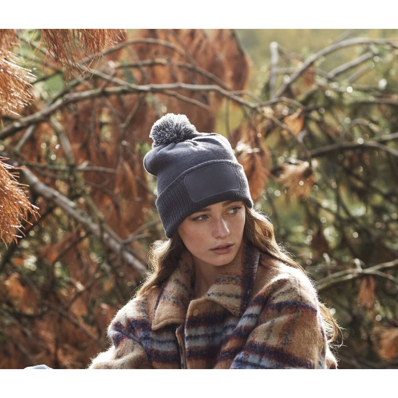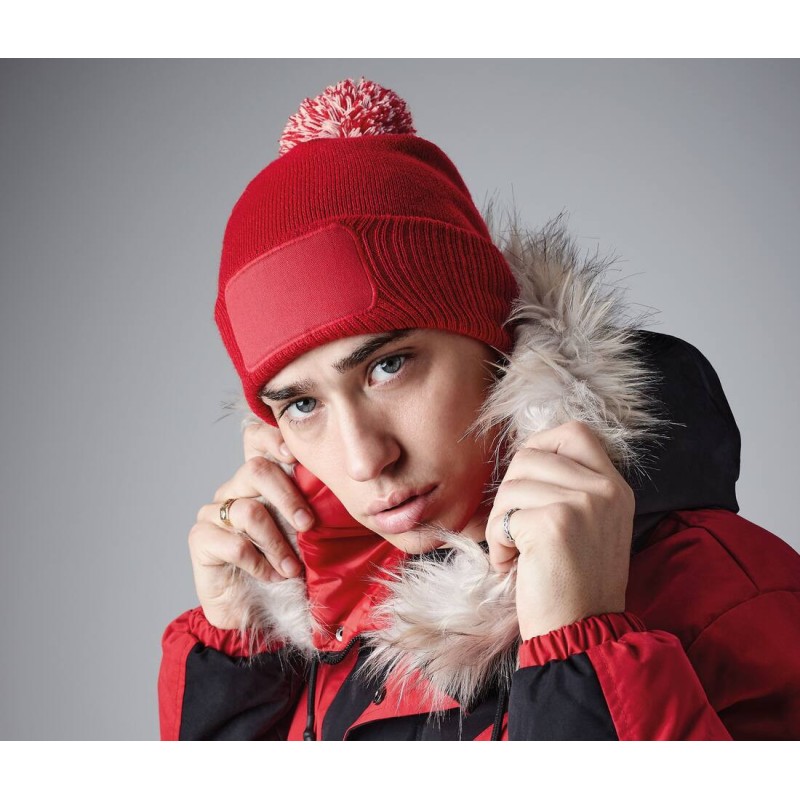 100% acrylique toucher doux (Heather - 55% polyester / 45% acrylique). Étiquette détachable TearAway. Revers côtelé. Pompon bicolore. Patch en coton sergé pour l'impression.