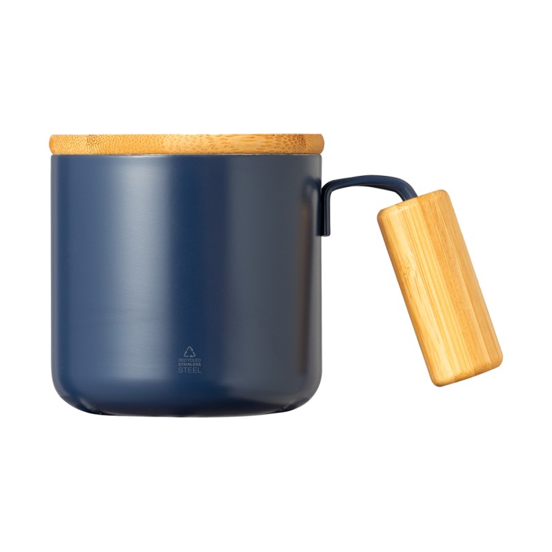 Mug thermos en acier inoxydable recyclé à double paroi avec poignée et couvercle en bambou. 330 ml.