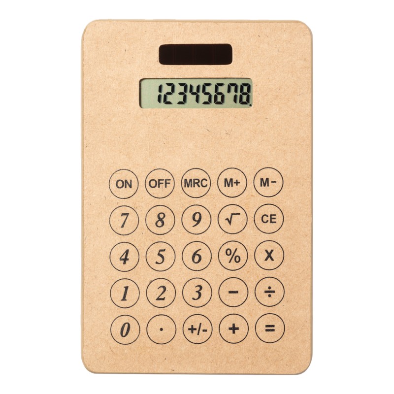 Calculatrice solaire à 8 chiffres dans un boîtier en papier recyclé. Livrée avec pile bouton.