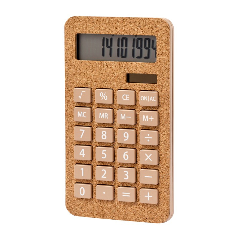 Calculatrice solaire à 10 chiffres dans un boîtier en liège naturel et en plastique. Pile bouton incluse.