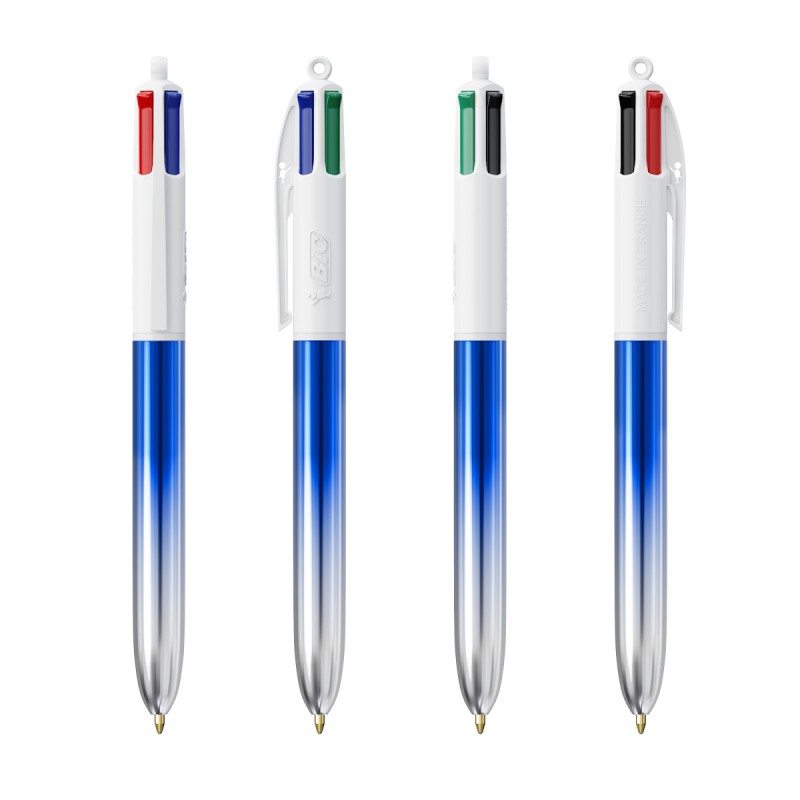 Découvrez notre BIC® 4 Couleurs® Bicolor ! Son effet métallique brillant unique combine 2 couleurs brillantes sur le corps, pour les designs les plus créatifs et un look métallique avec une touche artistique ! Nos stylos à bille BIC® 4 Couleurs® ont une longueur d'écriture moyenne de 8 000 m (tests SGS - longueur d'écriture moyenne pour les cartouches bleue, noire, rouge et verte). Notre emblématique BIC® 4 Couleurs® devient plus durable, avec désormais 13 % de plastique en moins dans la partie supérieure !