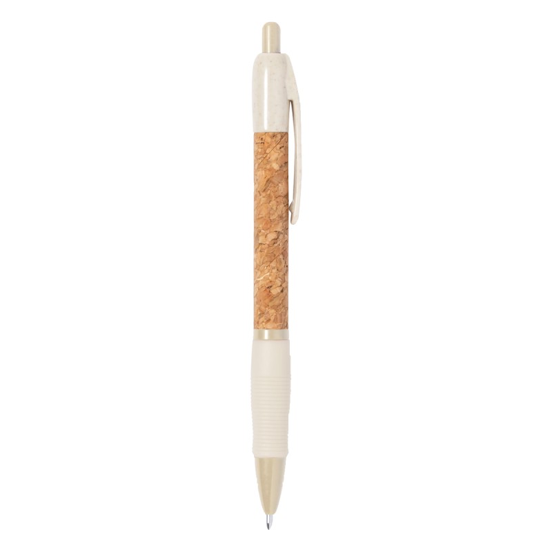 Stylo à bille écologique en paille de blé avec corps recouvert de liège naturel et embase en caoutchouc. Encre bleue.