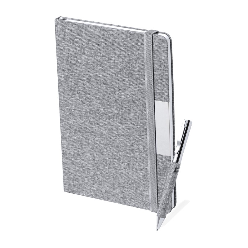 Cahier recouvert de polyester 300D RPET avec 100 feuilles lignées et élastique en caoutchouc. Comprend un stylo à bille en métal recouvert de polyester RPET, encre bleue. Labélisé RPET et Format A5.