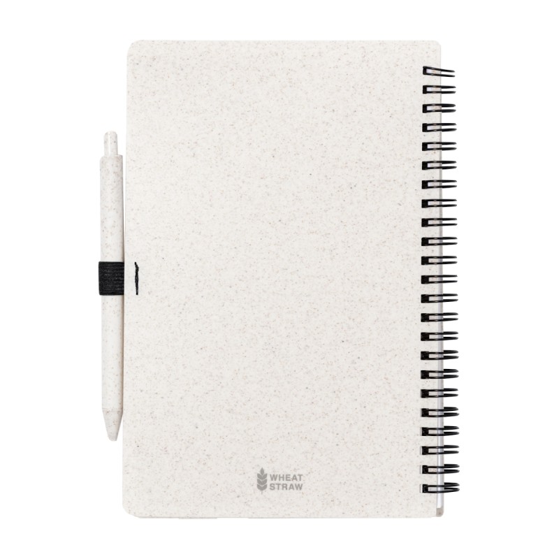 Carnet de notes à spirales écologique en plastique recouvert de paille de blé, 80 feuilles lignées en papier recyclé, format A5. Comprend un stylo à bille en plastique en paille de blé avec encre bleue.