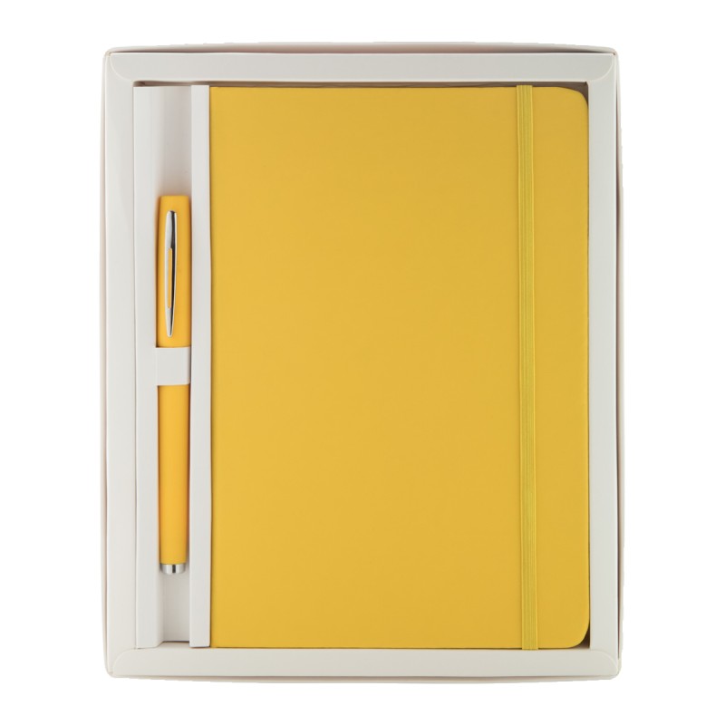 Set bloc-notes en simili-cuir de 100 pages non lignées et stylo à bille en plastique de couleur assortie. Encre bleue. Livré dans une boîte cadeau blanche.