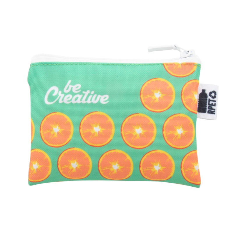 Porte monnaie zippé sur-mesure en polyester 600D. Labélisé RPET et impression en sublimation sur toute la surface. Quantité minimale : 50 pcs.