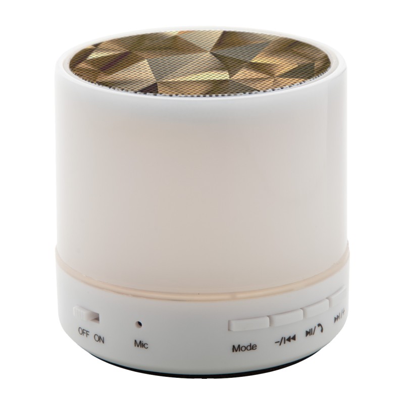 Enceinte Bluetooth avec boîtier en plastique et éclairage LED multicolore. Fonction appel mains libres, radio FM et batterie rechargeable intégrée. Livrée avec câble chargeur USB.