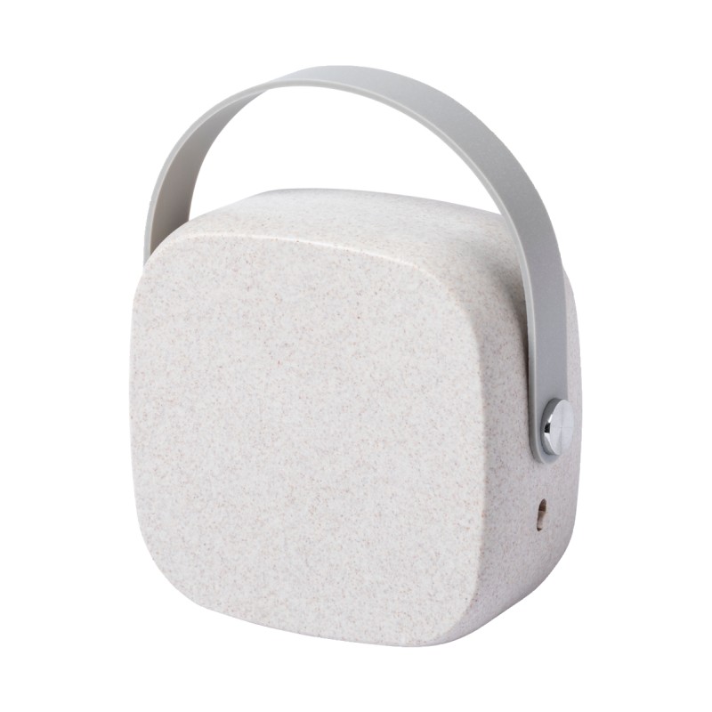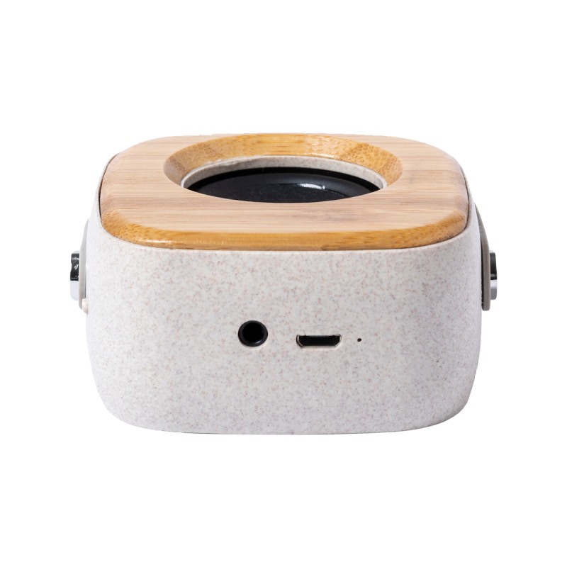 Enceinte Bluetooth en bambou et boîtier plastique écologique en paille de blé, avec batterie rechargeable intégrée. Câble chargeur USB inclus.