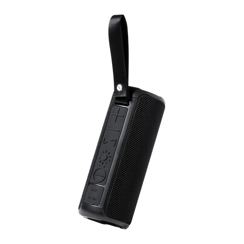 Enceinte Bluetooth en plastique ABS avec sangle de transport et batterie rechargeable intégrée. Avec lumière LED multicolore et 6 modes d'éclairage. Câble chargeur USB inclus.