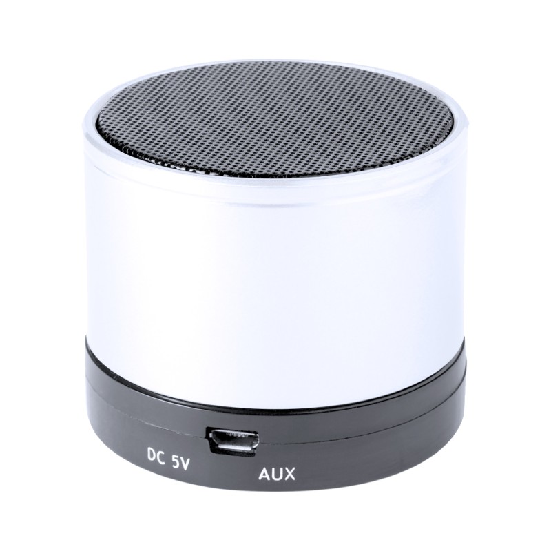 Enceinte Bluetooth avec boîtier métallique. Fonction main-libre, radio et mp3. Pile rechargeable intégrée. Livrée avec câble chargeur UBS et Aux-in.