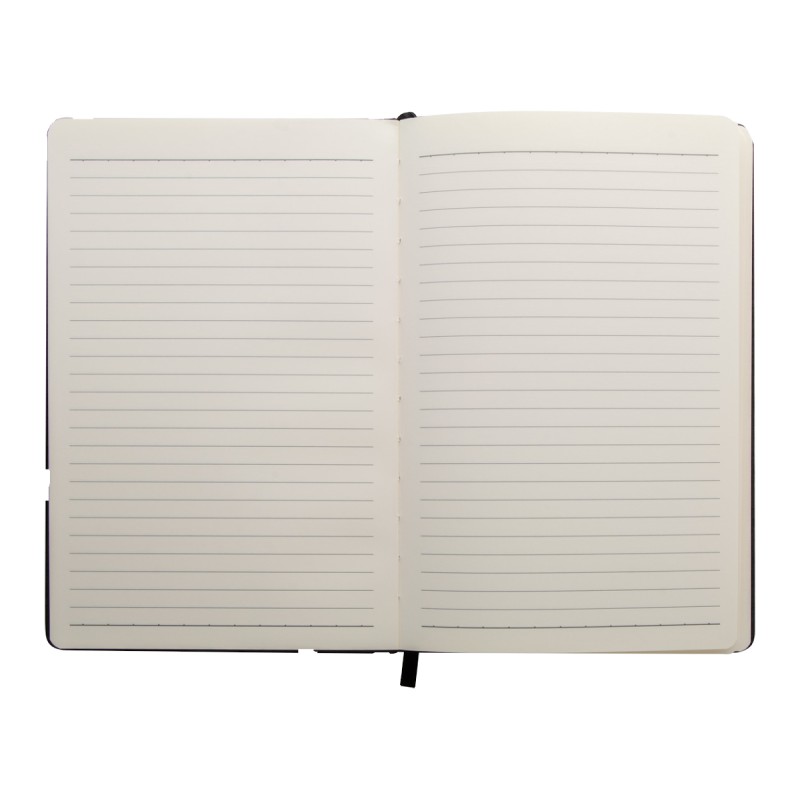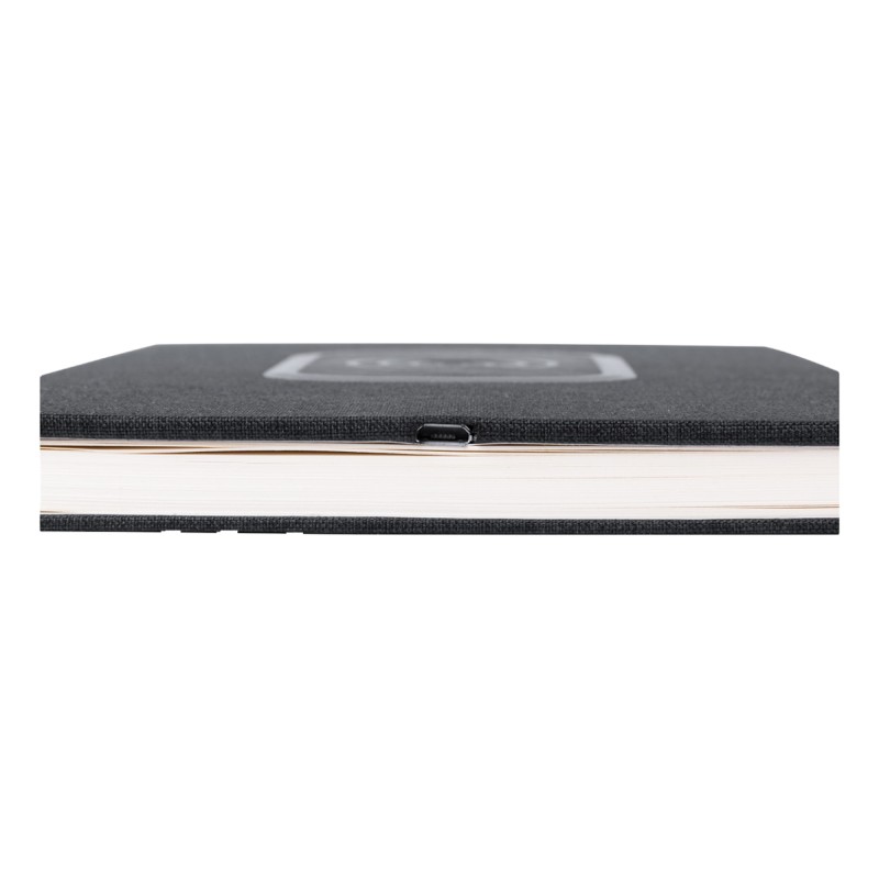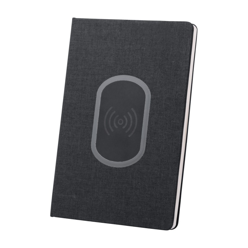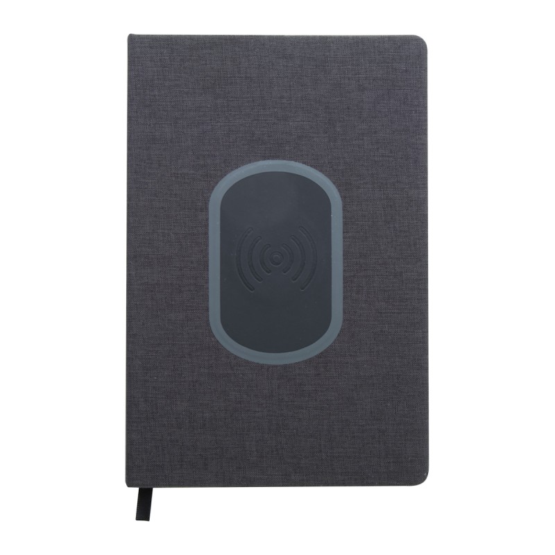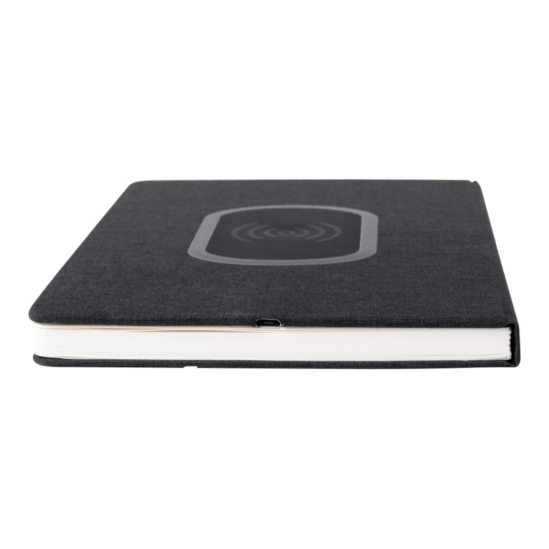 Porte-documents format A5 en polyester 300D avec chargeur sans fil intégré (5W) et bloc-notes 80 feuilles lignées. Câble USB fourni.