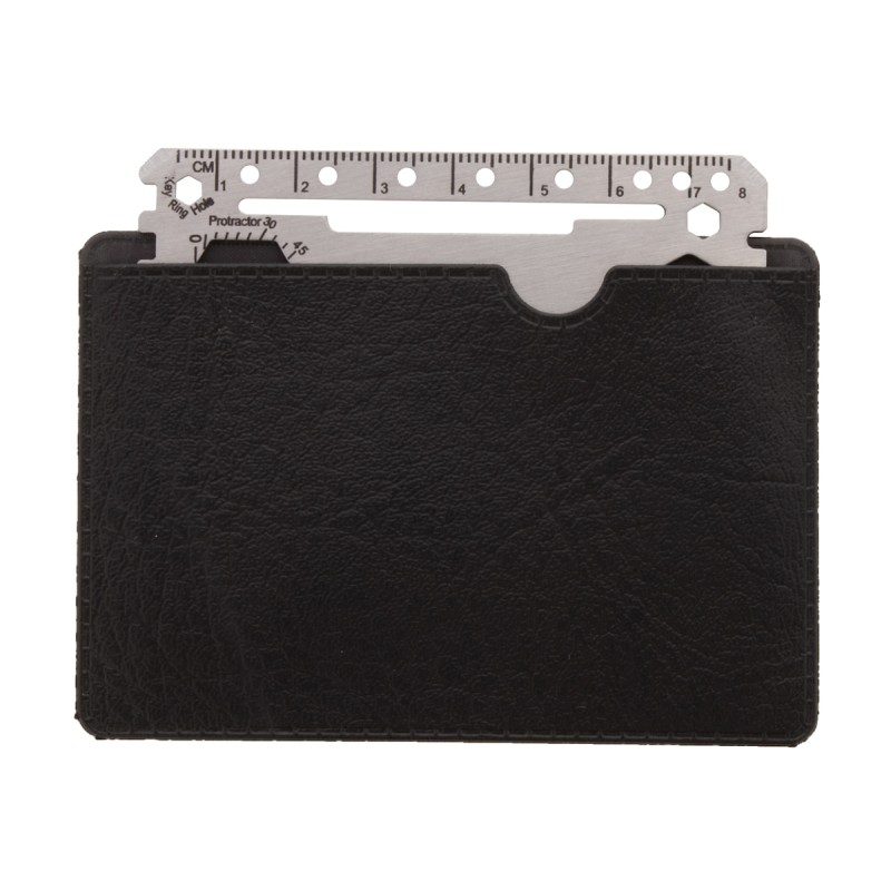 Outil multifonctions en acier inoxydable en forme de carte de crédit avec 20 fonctions. Livré dans une pochette en cuir PU.