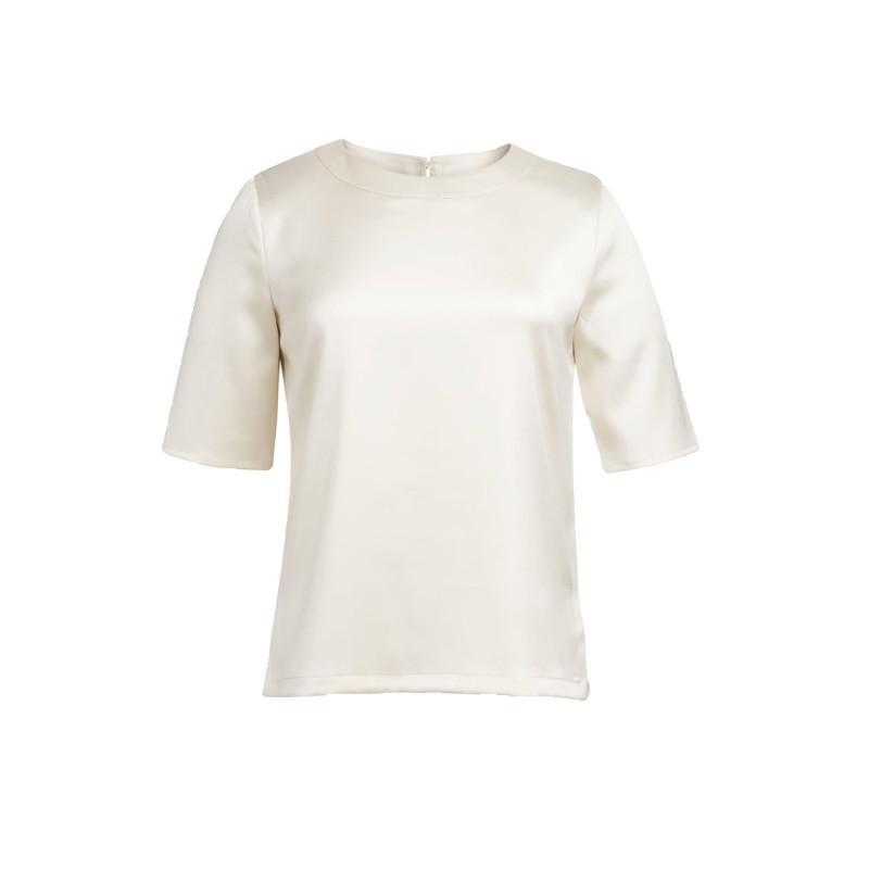 97% Polyester / 3% Élasthanne. Blouse stretch, facile à repasser. Manches courtes, col rond. Lavable en machine.